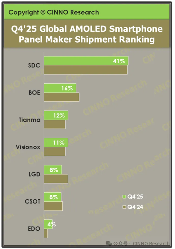 从市场格局来看,三星显示(SDC)市场份额缩窄,京东方(BOE)表现亮眼,以16.3%份额位居全球第二、国内第一,维信诺(Visionox)稳居全球第三、国内第二。第四季度,受海内外大促和新机发布带动,市场需求旺盛,全球出货量约2.6亿片,同比、环比双增长。该季度国内厂商出货份额占比50.8%,国产替代趋势加速。三星显示市场主导地位持续弱化,京东方市场份额稳定,天马(Tianma)出货量同比增长20%,市场份额上升,受益于客户订单和产能释放。未来,全球AMOLED智能手机面板市场竞争或更激烈。