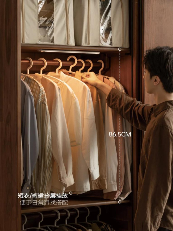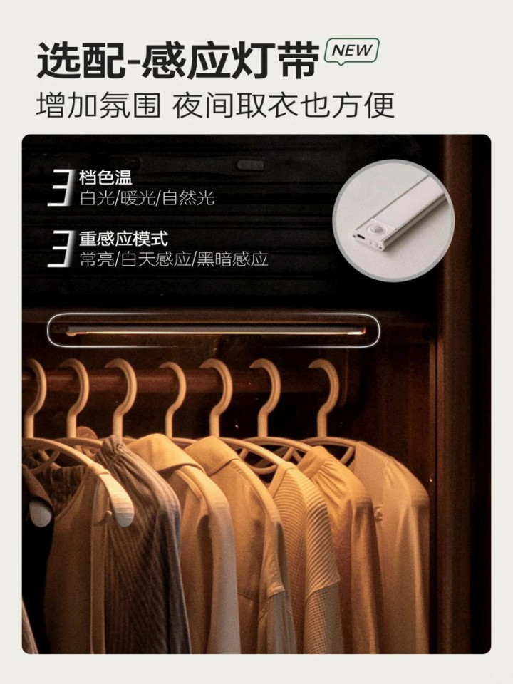 感应灯带:装在柜门内侧,人走近自动亮起,2700k暖黄光柔柔地洒在衣物上,深夜找衣服再也不用摸黑开大灯,打扰到家人。