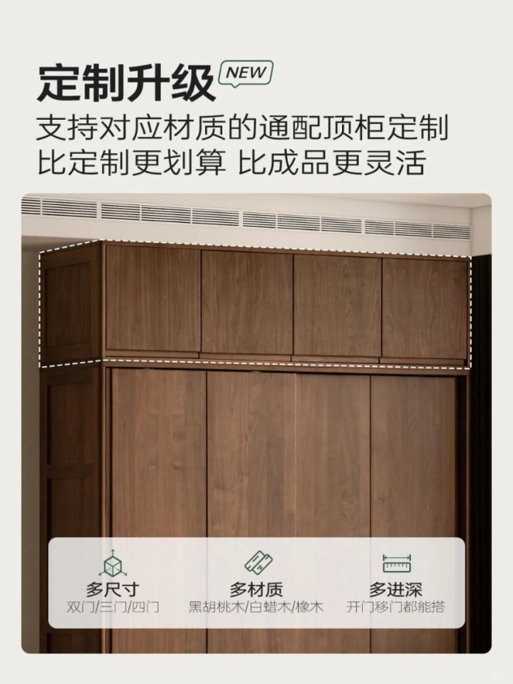 我家层高2.8米,普通成品衣柜做到2.4米,顶上那块40cm的空间成了灰尘收集器。源氏木语3.0的顶柜系统完美解决了这个bug——他们提供同材质、同色的通配顶柜,高度从20cm到60cm可选,真的"一柜到顶"。