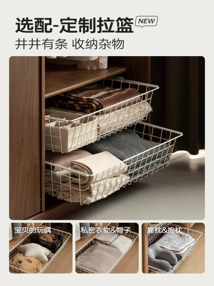 分隔拉篮:最下层我装了三个,袜子、内衣、围巾各就各位,透气性好还不怕变形。