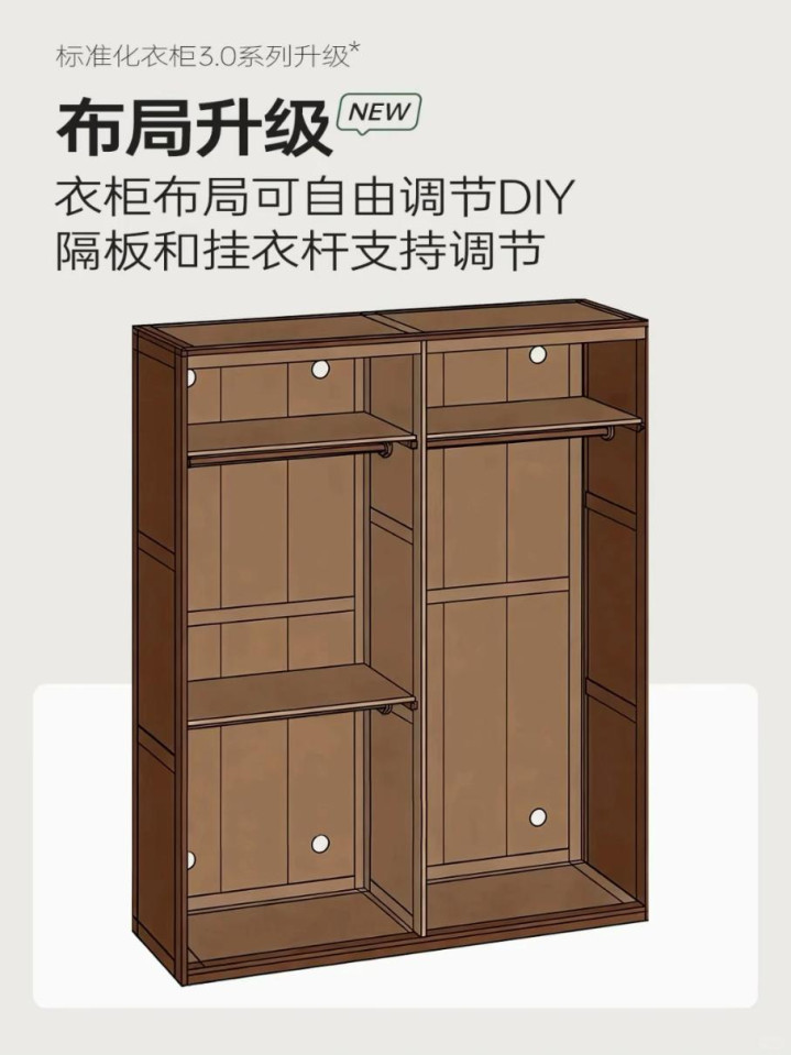 源氏木语衣柜3.0的第一个"魔法",藏在那些密布的调节孔里。传统衣柜的挂衣杆高度固定,长裙拖地、短衣浪费,换季时还得重新整理,简直是体力活。而这款衣柜的挂衣区每隔3.2cm就有一个调节孔,从60cm到180cm,想挂哪里挂哪里。