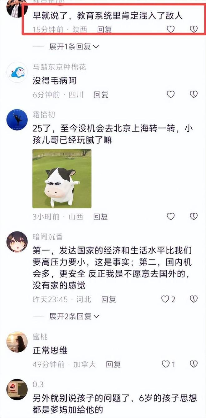 可评论区的网友们在看到男孩的这番发言后,却开始众说纷纭,有人觉得这是学校教育的问题,此前也有教材出现端倪的情况,因此当学生群体出现崇洋媚外的发言时,多数人都会下意识地怀疑:是不是教育系统混进了“敌人”?